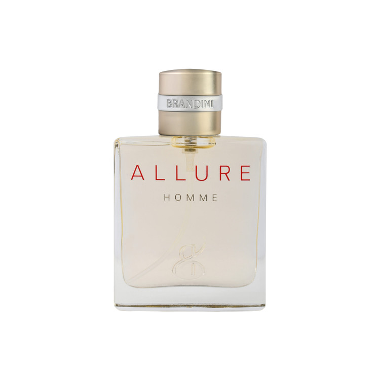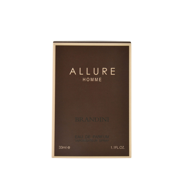 بطری این عطر طراحی ساده اما سنگین و مردانه دارد؛ نام Allure Homme در وسط بطری و لوگوی Brandini در قسمت بالایی آن جلوهای شیک و کلاسیک ایجاد کرده است.