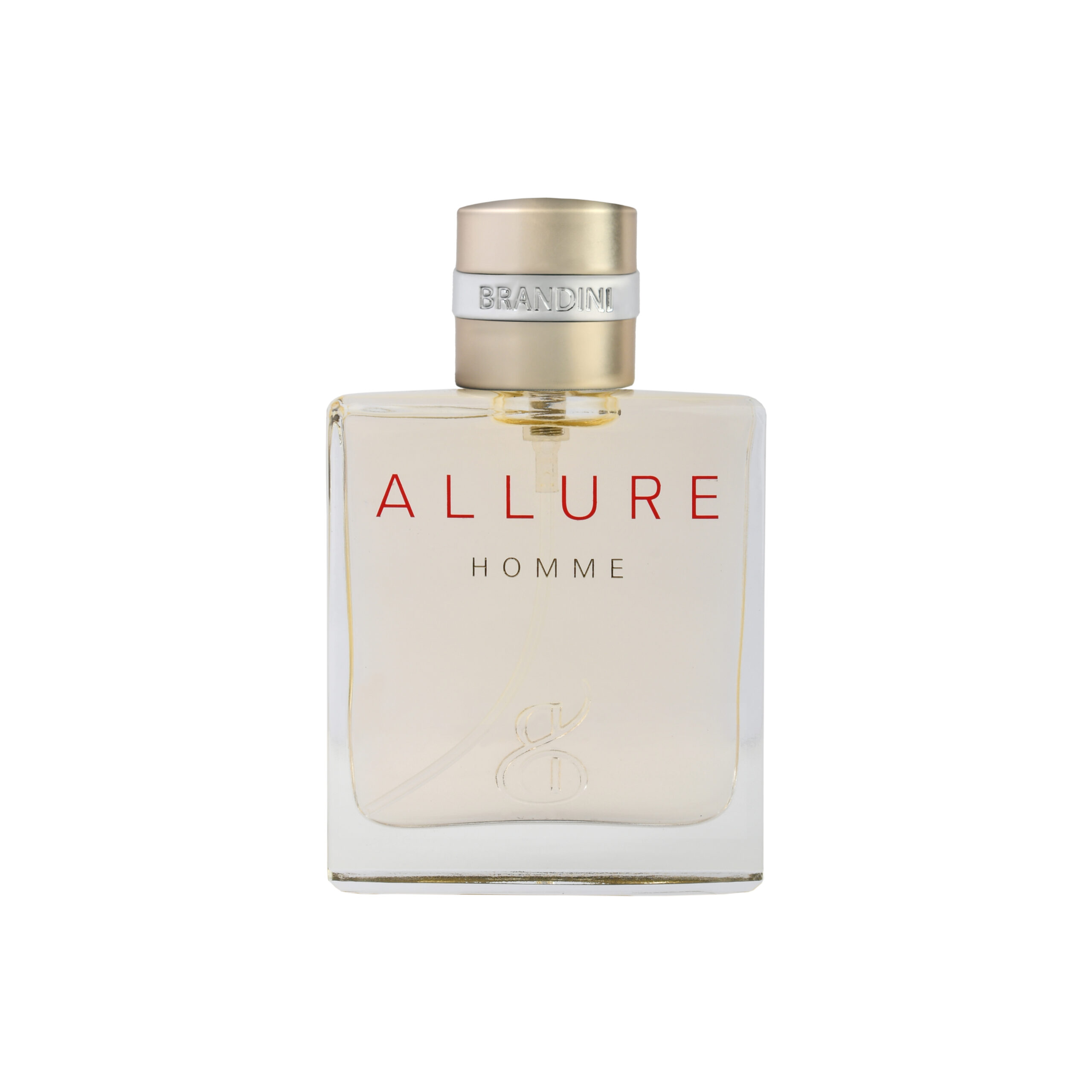 بطری این عطر طراحی ساده اما سنگین و مردانه دارد؛ نام Allure Homme در وسط بطری و لوگوی Brandini در قسمت بالایی آن جلوهای شیک و کلاسیک ایجاد کرده است.