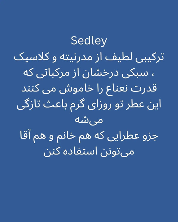 سدلی ترکیب مدرنیته و کلاسیک ، برای روزای بهاری و تابستونی مشخصات برای خانم و آقایان 33 میل مناسب فصل های بهار و تابستان خنک، چوبی و معطر تولید شده توسط شرکت برندینی #عطرسدلی#عطرزنانه_مردانه#عطر#عطرمردانه_سدلی#عطرزنانه_سدلی