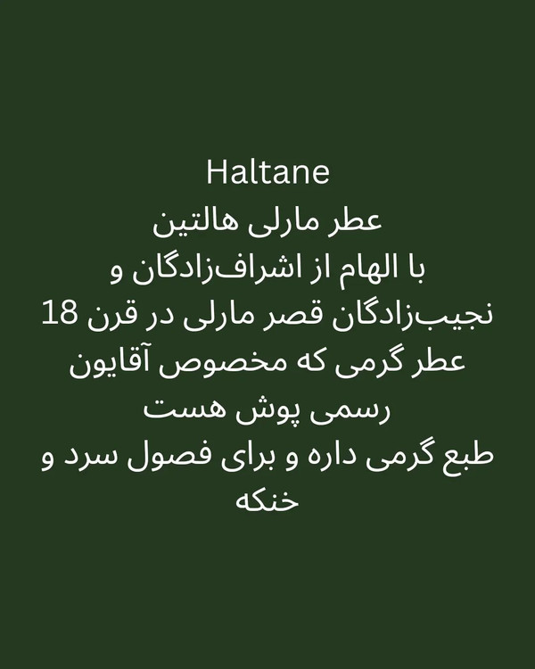 مارلی هالتین از اون دسته عطرهاست که هر آقایی باید تو کشوی میز کارش باشه،این عطر مناسب فضای اداری,روزانه و قرار های رسمی هستش. . مشخصات برای آقایان 33 میل مناسب برای فصل های بهار ، پاییز ، زمستان گرم، شیرین ، تلخ ، چوبی معطر تولید شده توسط شرکت برندینی .