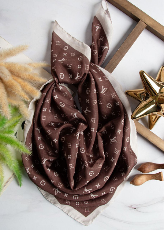 این طرح روبان (اسکارف) با الگوی تکراری حروف "LV" (مونوگرام لوئی ویتون) و نمادهای کوچک مثل گل و ستاره، متعلق به برند لوئی ویتون (Louis Vuitton) هست. این الگو که از سال ۱۸۹۶ توسط جورج ویتون طراحی شده، یکی از معروفترین امضاهای این برند فرانسوی محسوب میشه.