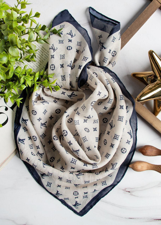 این طرح روبان (اسکارف) با الگوی تکراری حروف "LV" (مونوگرام لوئی ویتون) و نمادهای کوچک مثل گل و ستاره، متعلق به برند لوئی ویتون (Louis Vuitton) هست. این الگو که از سال ۱۸۹۶ توسط جورج ویتون طراحی شده، یکی از معروفترین امضاهای این برند فرانسوی محسوب میشه