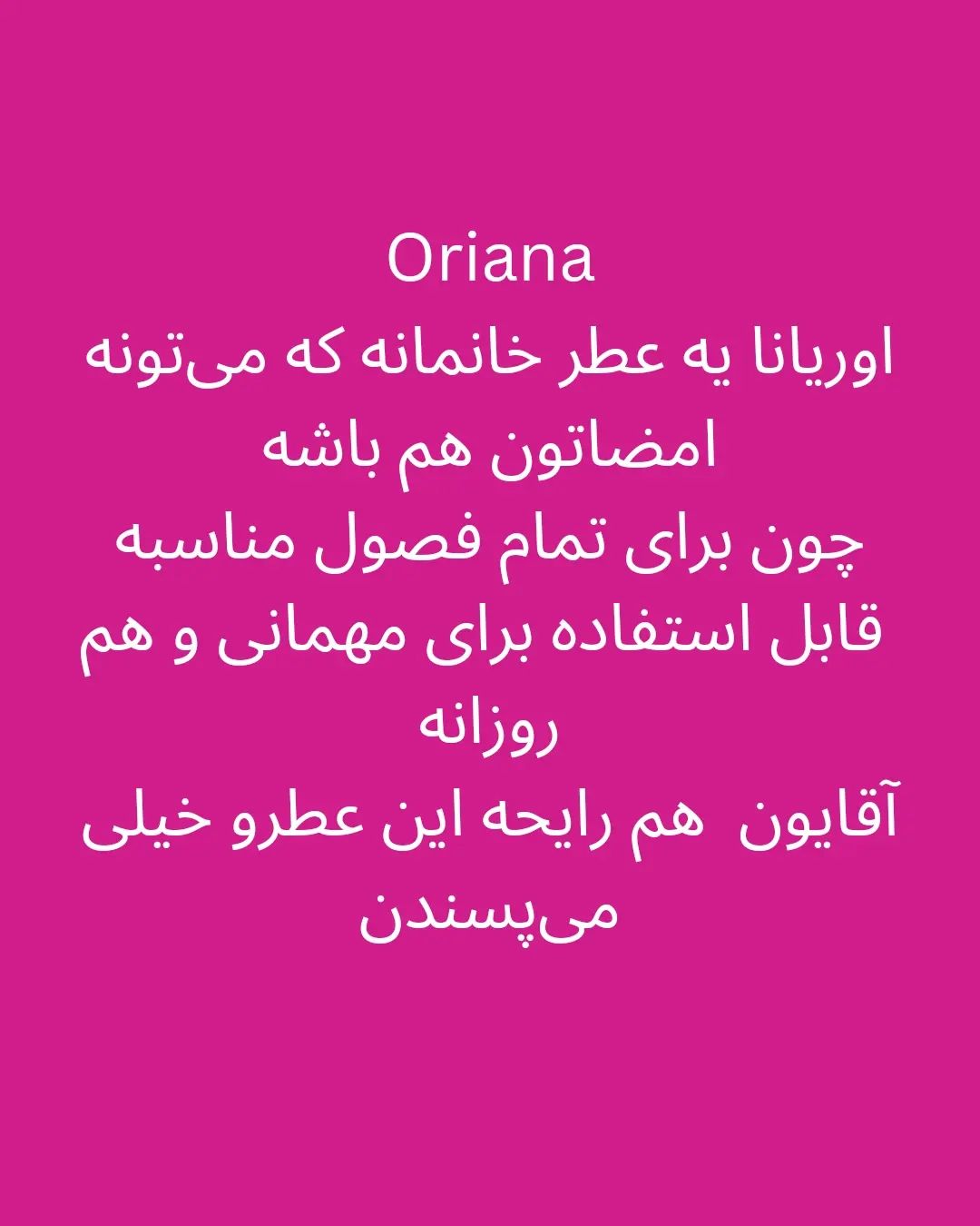 اوریانا، عطری که هم ملایمه و هم ماندگاری بالایی داره و چون برای تمام فصول استفاده میشه ،میتونه امضای شما باشه و هرکس که این بو رو حس کرد یاد شما بیوفته. . . مشخصات برای بانوان ۳۳ میل ملایم و شیرین برای تمام فصول تولید شده توسط شرکت برندینی . ت .