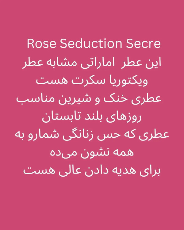رز سداکشن سکرت، عطری اماراتی از شرکت فرگرانس که مشابه عطر ویکتوریا سکرت هست. عطری که برای بانوان منحصر به فرد و جذاب هست. باتوجه به و محبوبیت بین خانم ها بهترین گزینه برای هدیه دادنه... . . مشخصات : مناسب بانوان ۱۰۰میل خنک و شیرین برای بهار و تابستان تولید شده توسط شرکت اماراتی فرگرانس . .
